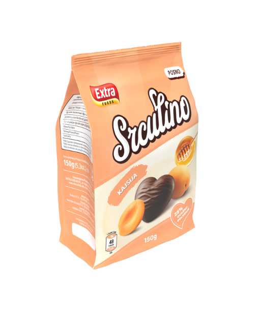 Срцулино Кајсија – вкусни колачиња во форма на срце исполнети со нежен крем со вкус на кајсија. Совршен баланс на слаткост и свежо овошно задоволство. Пакување од 150 грама.